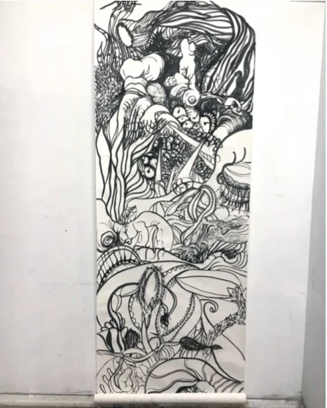 Ramble/ Autocorpse pt 1, 2019, India ink on paper scroll 304 x 91 cm